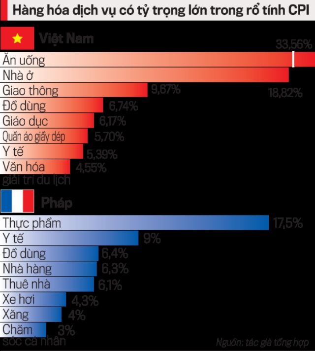 Tỷ trọng của các hàng hóa dịch vụ trong chỉ số giá tiêu dùng ở Pháp hiện nay cao nhất là thực phẩm, với 17,5%, nếu tính cả ăn uống ở nhà hàng là 23,9%. Nếu so sánh với Việt Nam thì riêng tỷ trọng này ở Việt Nam đã là 33,56%. Các nhóm hàng hóa dịch vụ trong rổ tính CPI cũng khác nhau giữa Pháp và Việt Nam. Chẳng hạn Pháp chia cụ thể: xe hơi, xăng dầu, chăm sóc cá nhân và giáo dục không đáng kể, thì ở Việt Nam lại có giáo dục, quần áo, giầy dép.
