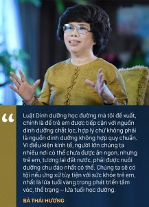 Mới đây, câu chuyện Luật Dinh Dưỡng Học Đường lại được khơi gợi lên qua tâm sự của bà Thái Hương- “người đàn bà sữa”, nhà sáng lập, Chủ tịch Hội đồng chiến lược THtruemilk. Ngay từ khi khởi dựng Dự án sữa, bà đã tự tay mình viết lên tầm nhìn, sứ mệnh của mình: “Một quốc gia chỉ vững mạnh khi con người được phát triển toàn diện cả thể lực và trí lực, trong đó yếu tố tiên quyết cho sự phát triển này không những là nguồn dinh dưỡng thiết yếu như lúa, gạo, thực phẩm và các sản phẩm sữa mà cần có một chế độ chăm sóc sức khỏe bền vững. Đầu tư vào phát triển thể lực và trí lực là phát triển nòi giống của dân tộc, là đầu tư vào phát triển bền vững mang tính chiến lược quốc gia”.