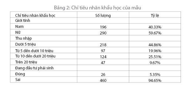 Một khảo sát đã được tiến hành dựa trên dữ liệu sơ cấp thu thập từ các phiếu điều tra được phân phối cho đối tượng là nhà đầu tư tiềm năng trên địa bàn thành phố Hà Nội và thành phố Hồ Chí Minh, dữ liệu được thu thập từ các trường đại học lớn, các công ty chứng khoán và UBCKNN. Sau khi tiến hành lọc phiếu khảo sát không phù hợp, kết quả tổng cộng thu về được 486 câu trả lời hợp lệ. Bảng 2 hiển thị một số đặc điểm nhân khẩu học cơ bản của người tham gia trả lời. Trong số 486 người tham gia trả lời, có hơn 59% người là nữ và gần 41% là nam, khoảng 58% số người được hỏi là sinh viên, phản ánh thực tế rằng các trường đại học được đưa vào như một trong những địa điểm thu thập dữ liệu chính. Nhân viên văn phòng và những người làm công việc chuyên môn như giáo viên, bác sỹ, luật sư… chiếm tới 41% số người được hỏi và phần còn lại là những người làm việc tự do hoặc nội trợ. Độ tuổi của người tham gia khảo sát phù hợp với đặc điểm công việc, với tỷ lệ gần 58% ở độ tuổi 18 – 22, và hơn 33% người trả lời ở độ tuổi 23 – 40. Có khoảng 45% số người được hỏi có thu nhập dưới 5 triệu đồng một tháng, hầu hết rơi vào nhóm sinh viên.
