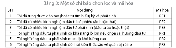 Bộ câu hỏi trong nghiên cứu được xây dựng dựa trên khuôn mẫu TPB có hiệu chỉnh, và các nhân tố bao gồm: Thái độ, Chuẩn xã hội, Nhận thức kiểm soát hành vi, Thông hiểu tài chính, Nhận thức rủi ro và Kinh nghiệm quá khứ. Trong số các bộ nhân tố này, hai nhóm nhân tố là Nhận thức rủi ro và Kinh nghiệm quá khứ có thể cung cấp thêm một số thông tin chi tiết hơn về khả năng tiếp cận đầu tư của nhà đầu tư cá nhân ở Việt Nam. Bảng 3 mô tả các chỉ báo (indicators) cụ thể của hai nhóm nhân tố này.