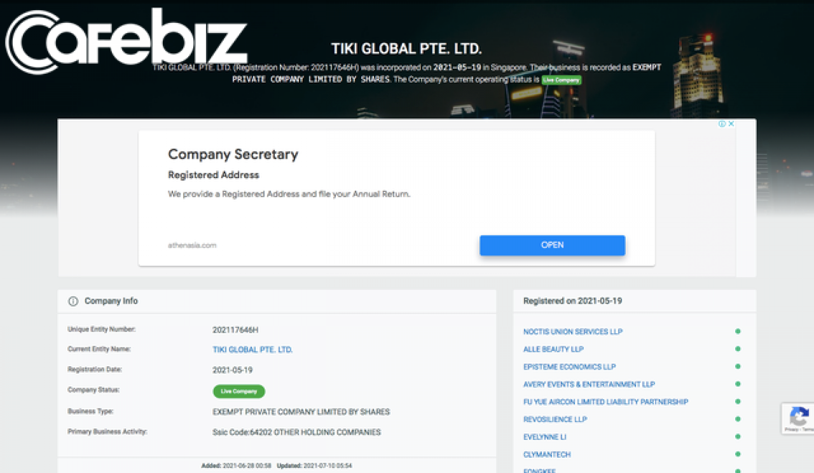 Thông báo thành lập Tiki Global từ Chính phủ Singapore.